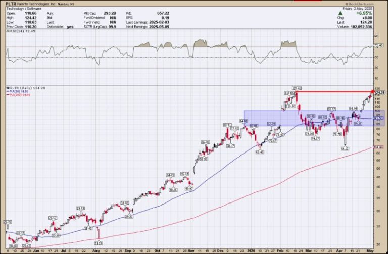FIGURE 1. DAILY CHART OF PLTR STOCK. The stock closed below its all-time high and has a history of big gaps on earnings day.Chart source: StockCharts.com. For educational purposes.